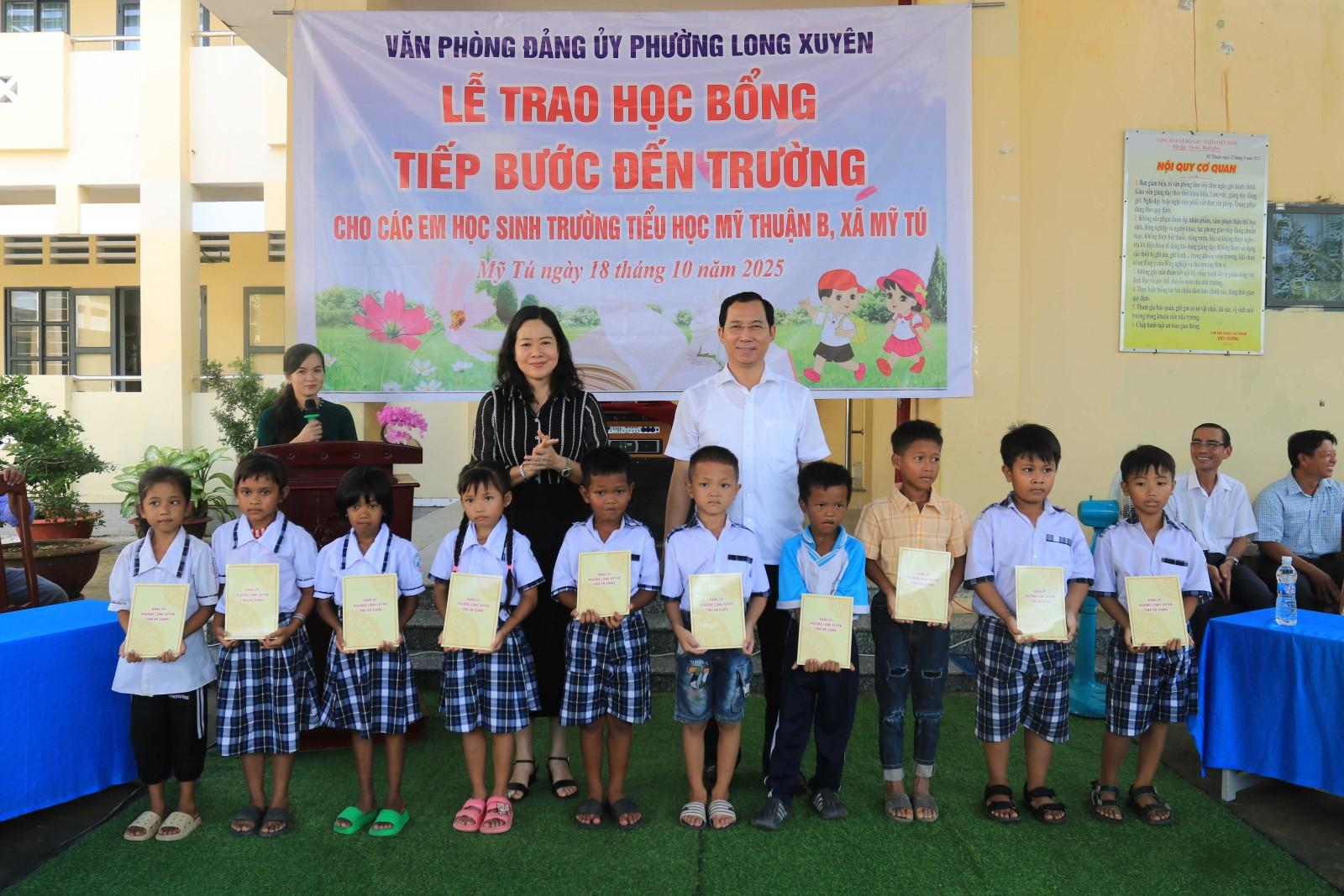 Theo đó, tại xã Mỹ Tú, Văn phòng Đảng ủy phường Long Xuyên đã trao 20 suất học bổng “Tiếp bước đến trường” cho học sinh có hoàn cảnh khó khăn và đồng bào Khmer của Trường Tiểu học Mỹ Thuận B. Mỗi suất trị giá 1 triệu đồng tiền mặt, từ nguồn vận động xã hội hóa.