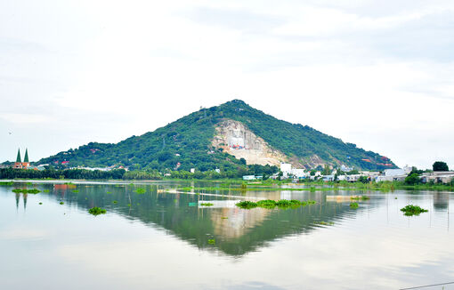 Bức tranh thiên nhiên ngoạn mục của núi Sam, phường Vĩnh Tế trong mùa nước nổi. Ảnh: THANH TIẾN