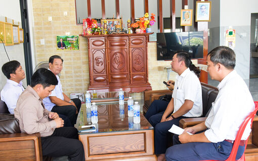 Lãnh đạo xã Vĩnh Phong thăm hỏi và vận động gia đình thực hiện các chương trình hành động thực hiện các mục tiêu nghị quyết Đại hội Đảng bộ xã nhiệm kỳ 2025 - 2030. Ảnh: DƯƠNG TUẤN