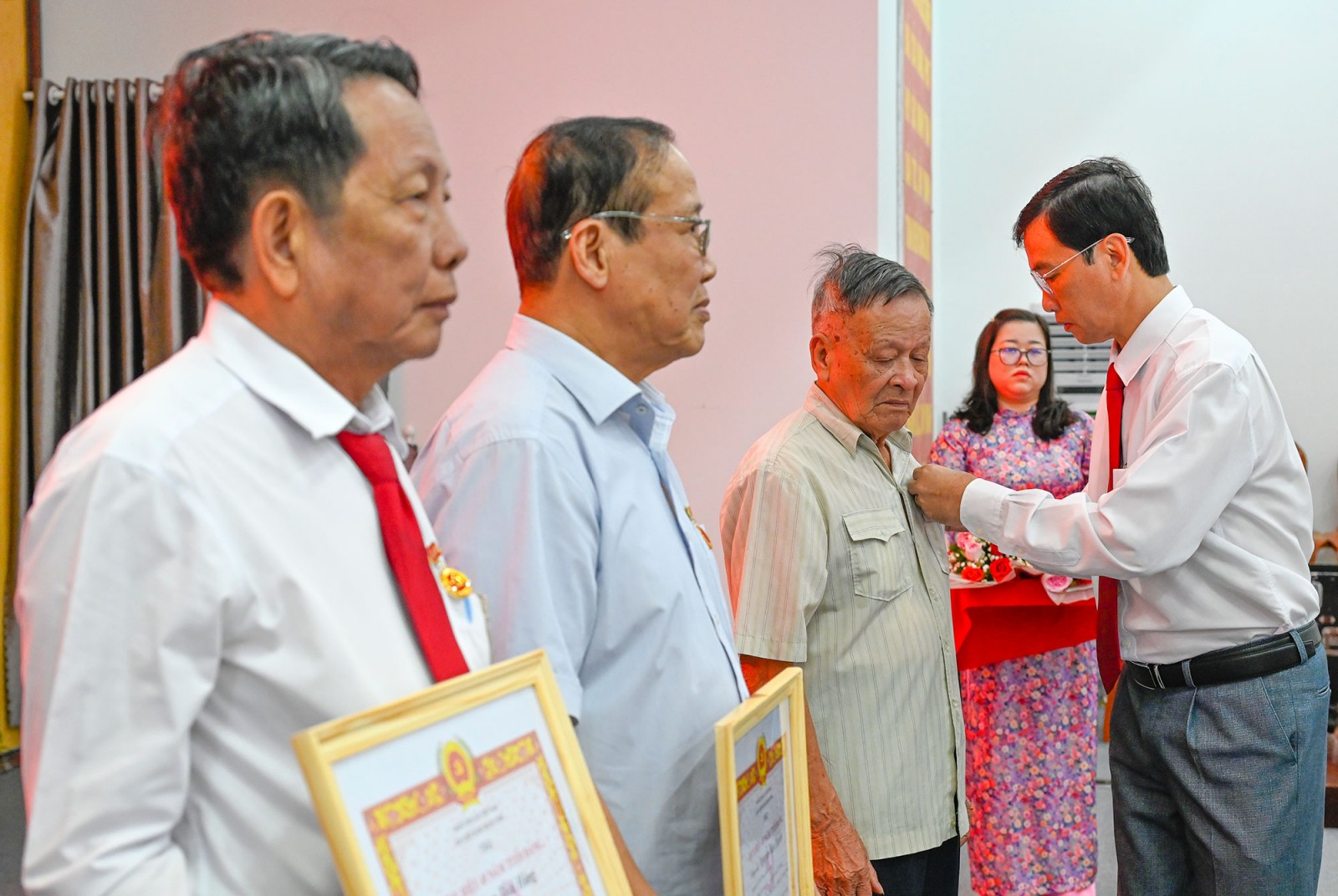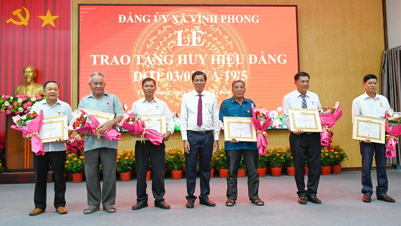 Theo đó, Ban Thường vụ Đảng ủy xã Vĩnh Phong trao tặng Huy hiệu Đảng cho 11 đảng viên, trong đó có 1 đảng viên nhận Huy hiệu 60 năm tuổi Đảng, 1 đảng viên 55 năm tuổi Đảng, 2 đảng viên 45 năm tuổi Đảng; 4 đảng viên 40 năm tuổi Đảng và 3 đảng viên nhận Huy hiệu 30 năm tuổi Đảng.
