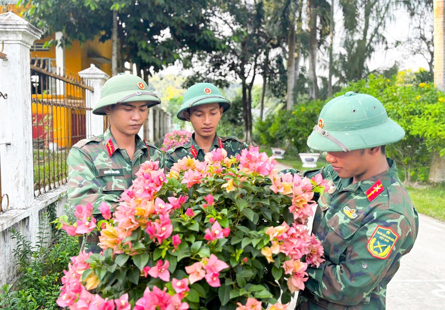 Chiến sĩ Đại đội 5 chăm sóc bồn hoa, cây cảnh. Ảnh: THU OANH