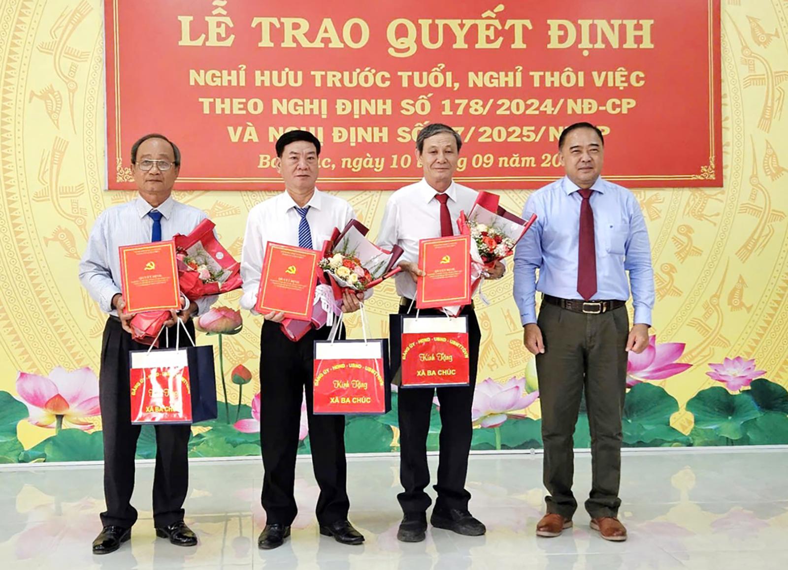 Ngày 10/9, Đảng ủy, HĐND, UBND, UBMTTQVN xã Ba Chúc (tỉnh An Giang) tổ chức lễ công bố và trao quyết định nghỉ hưu, nghỉ thôi việc theo Nghị định số 178/2024/NĐ-CP và Nghị định số 67/2025/NĐ-CP của Chính phủ cho các cán bộ.