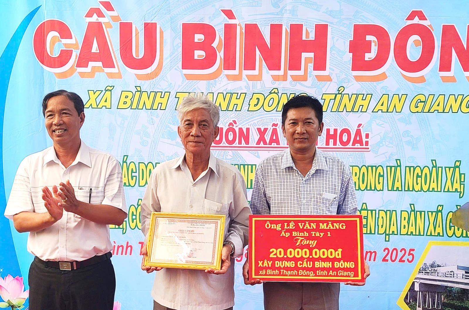 UBND xã Bình Thạnh Đông tiếp nhận tiền hỗ trợ xây dựng cầu gần 600 triệu đồng.