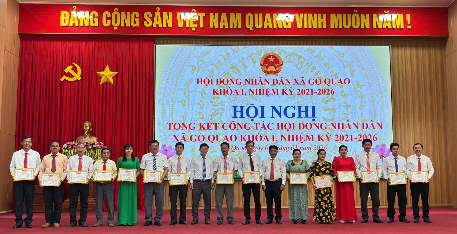 Dịp này, UBND xã Gò Quao khen thưởng 3 tập thể, 16 cá nhân hoàn thành xuất sắc nhiệm vụ HĐND xã khóa I, nhiệm kỳ 2021 - 2026.