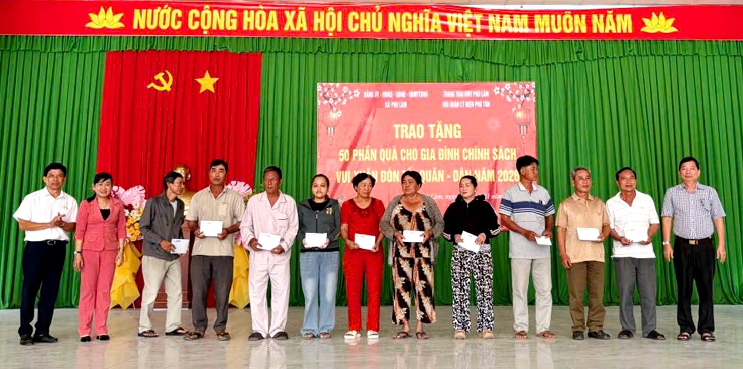 Nằm trong chuỗi hoạt động Tết Quân - Dân năm 2026, Đảng ủy, HĐND, UBND, Ủy ban MTTQ Việt Nam xã Phú Lâm (tỉnh An Giang) tổ chức trao 50 phần quà cho gia đình chính sách, người có công với cách mạng trên địa bàn xã.