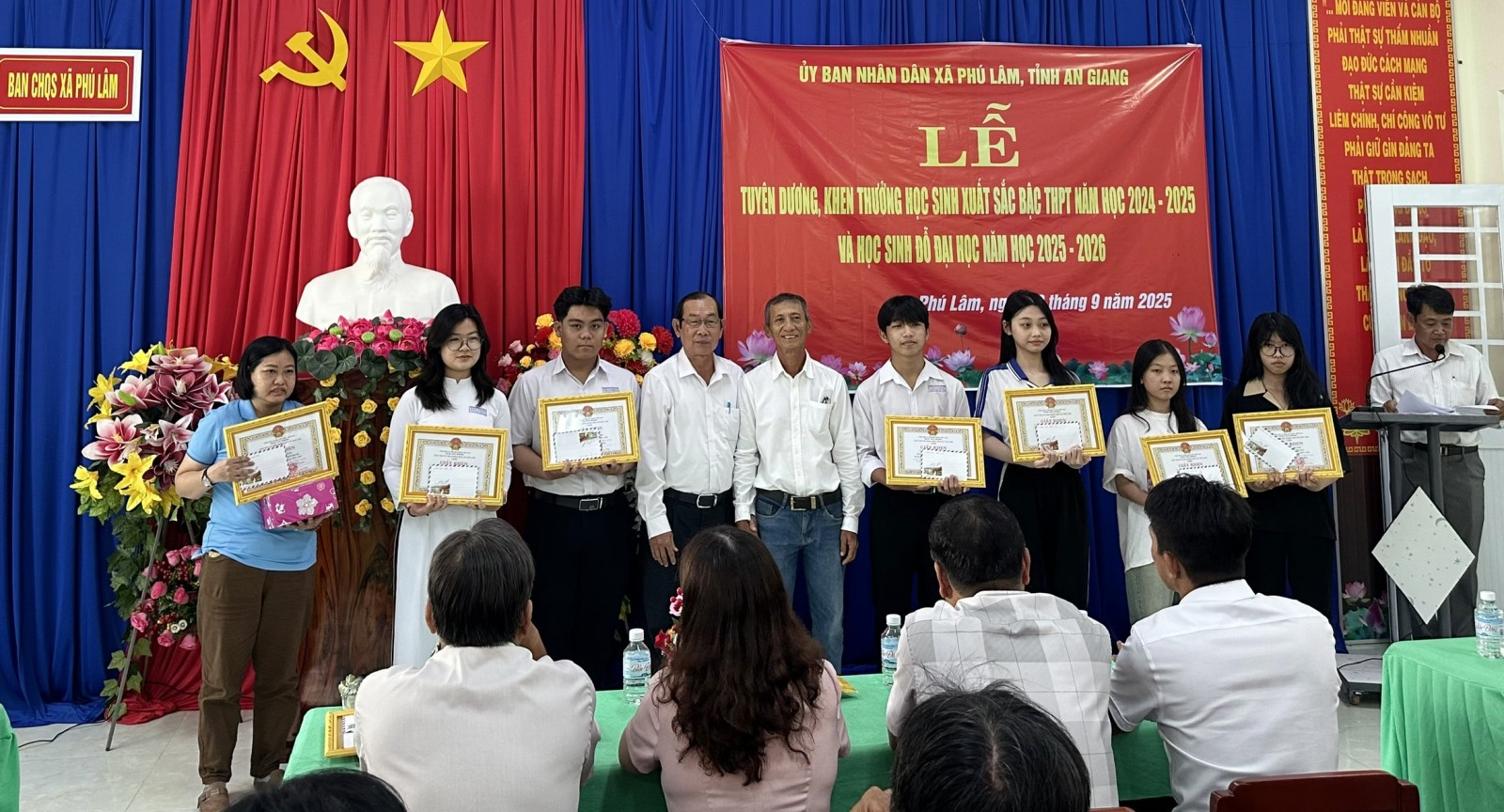 Năm nay, xã Phú Lâm có 29 học sinh giỏi bậc trung học phổ thông và 35 học sinh trúng tuyển vào các trường đại học được vinh danh. Trong buổi lễ, ban tổ chức còn dành thời gian cho các em dâng hoa, tri ân cha mẹ đã chăm sóc trong suốt quá trình học tập.