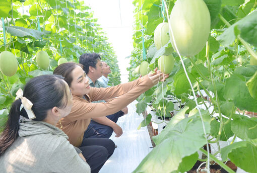 Nông dân xã Sơn Kiên phát triển mô hình trồng dưa lưới trong nhà màng.