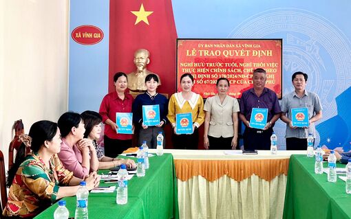 Chiều 10/9, UBND xã Vĩnh Gia (tỉnh An Giang) tổ chức lễ công bố và trao quyết định nghỉ hưu trước tuổi, nghỉ thôi việc theo Nghị định số 178/2024/NĐ-CP và Nghị định số 67/2025/NĐ-CP của Chính phủ cho các cán bộ, công chức.