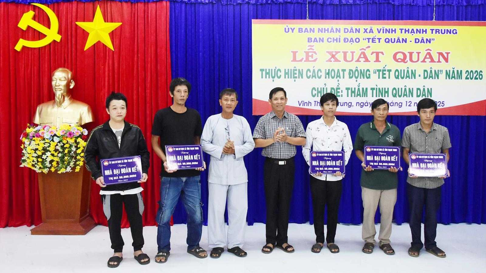 Tại lễ ra quân, Ban Chỉ đạo Tết Quân - Dân xã Vĩnh Thạnh Trung trao bảng tượng trưng hỗ trợ kinh phí xây dựng 5 căn nhà Đại đoàn kết cho hộ nghèo, hộ có hoàn cảnh khó khăn về nhà ở. Mỗi căn nhà trị giá 50 triệu đồng, do Ban Trị sự Giáo hội Phật giáo Hòa Hảo xã Vĩnh Thạnh Trung hỗ trợ.