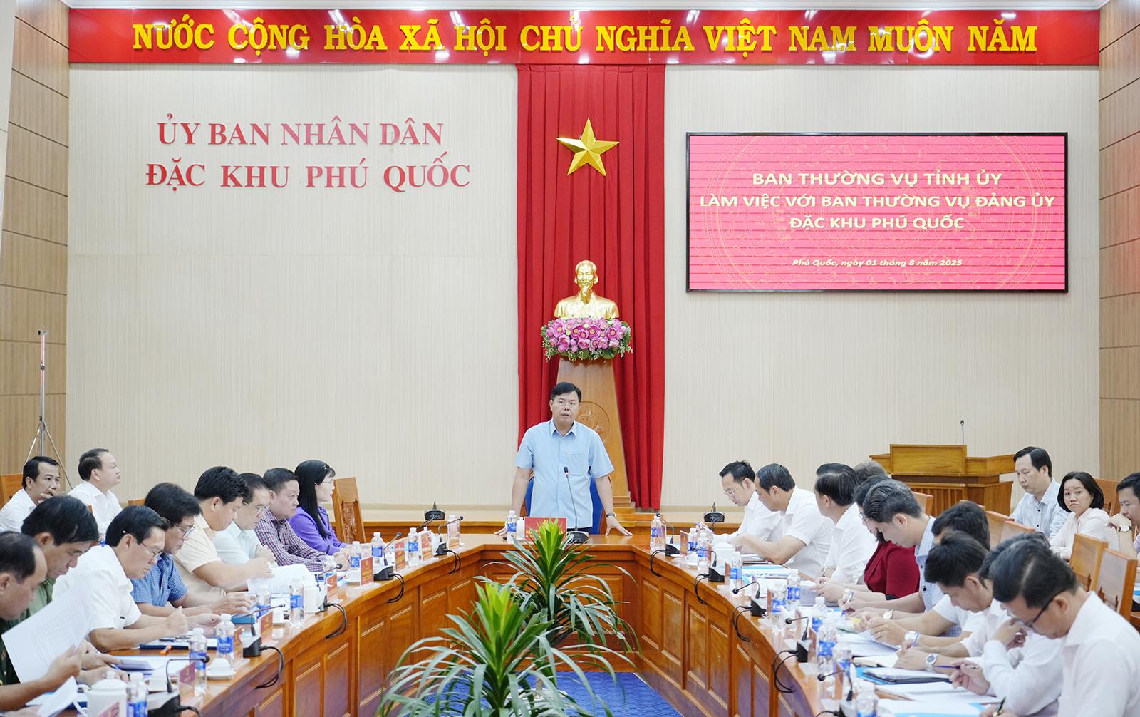 Tại buổi làm việc, Ban Thường vụ Tỉnh ủy nghe Ban Thường vụ Đảng ủy Đặc khu Phú Quốc báo cáo tình hình chuẩn bị đại hội của đảng bộ và dự kiến thời gian tổ chức đại hội.