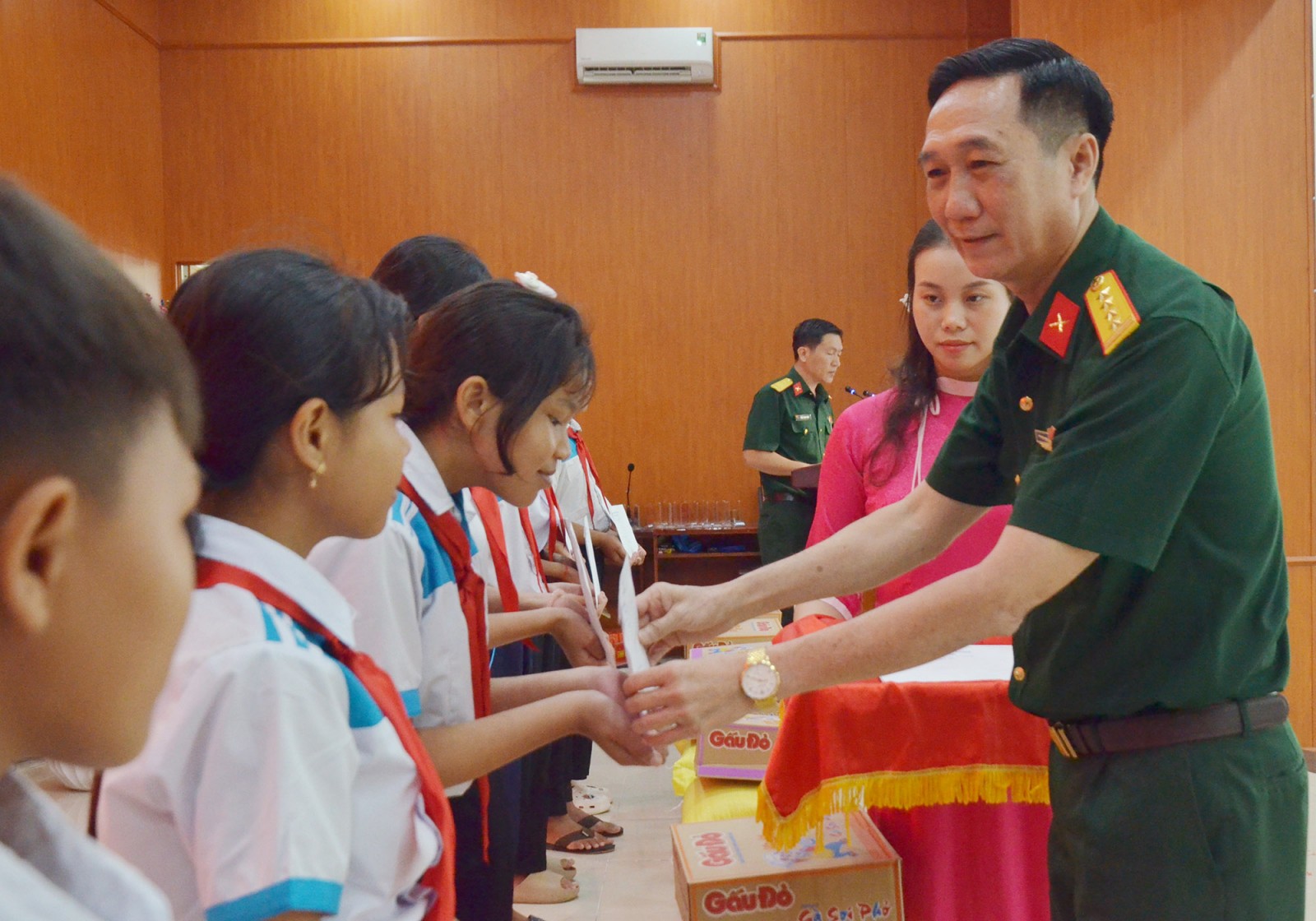 Đại tá Cao Minh Tâm trao quà, học bổng cho học sinh.