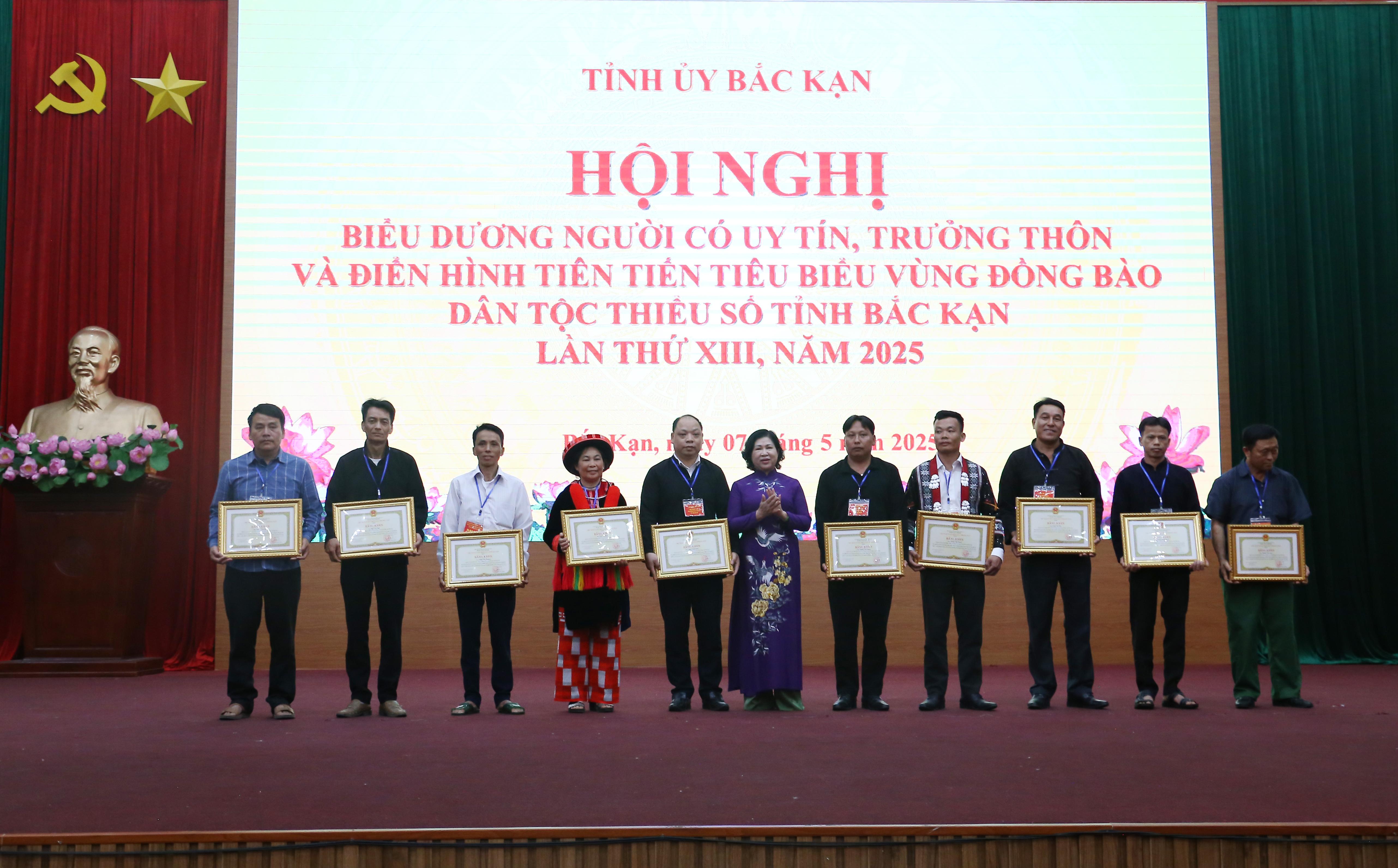 | Đ/c Phương Thị Thanh - Phó Bí thư Thường trực Tỉnh ủy, Chủ tịch HĐND tỉnh trao Bằng khen của Chủ tịch UBND tỉnh cho 10 cá nhân là người uy tín tiêu biểu có thành tích xuất sắc trong công tác an ninh trật tự và vận động Nhân dân tham gia Phong trào “Toàn dân bảo vệ an ninh Tổ quốc” trong vùng đồng bào DTTS trên địa bàn tỉnh Bắc Kạn giai đoạn 2023-2024 |