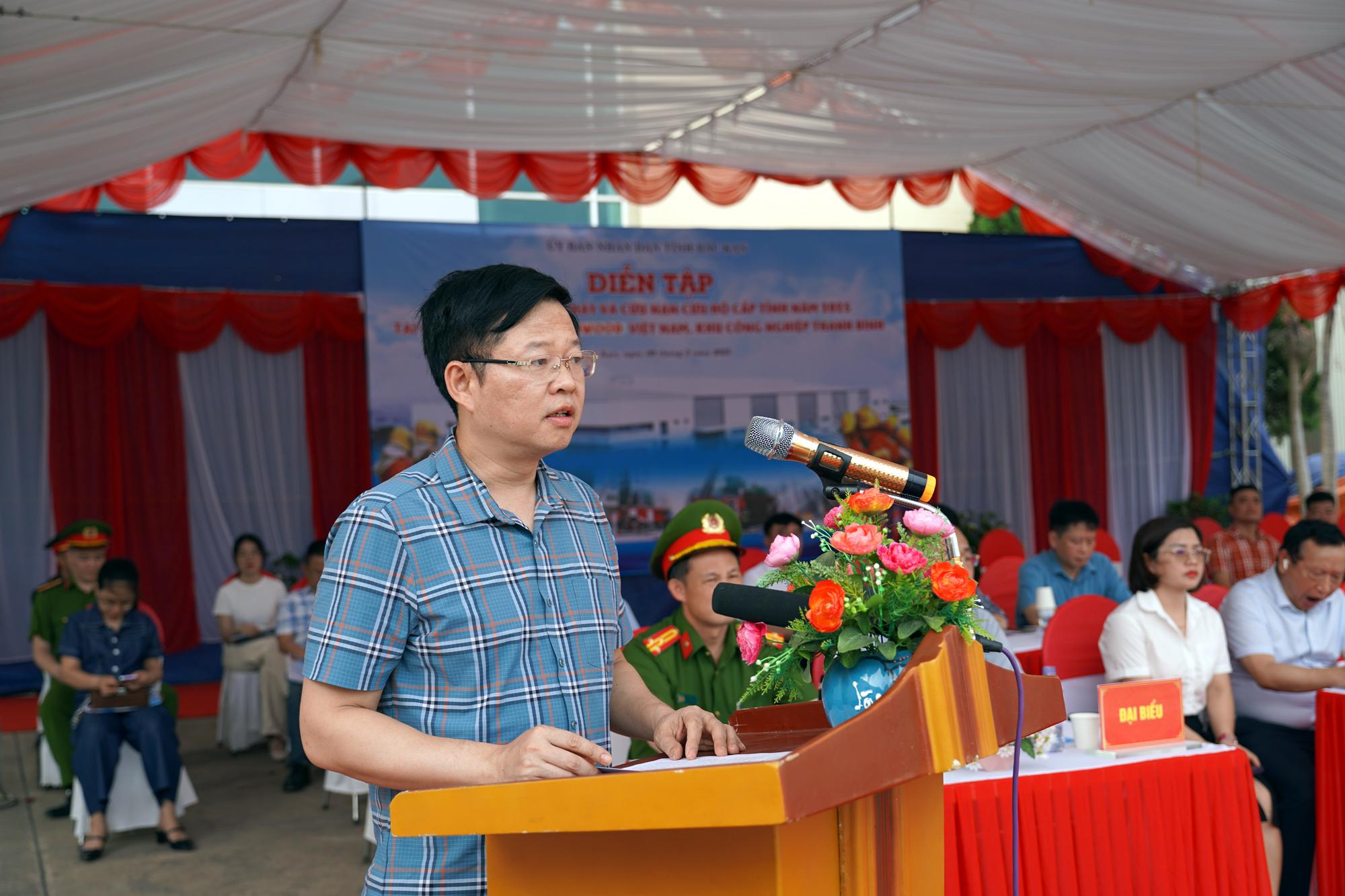 Đồng chí nhấn mạnh, kinh tế - xã hội trên địa bàn tỉnh đang ngày càng phát triển, các khu đô thị, khu công nghiệp mới dần được hình thành, nhu cầu sử dụng điện, năng lượng tăng… dẫn đến tiềm ẩn nhiều nguy cơ xảy ra cháy, nổ lớn, gây thiệt hại nghiêm trọng về người và tài sản. Trước tình hình trên, cuộc diễn tập được tổ chức nhằm giúp các doanh nghiệp chủ động xử lý các tình huống cháy, nổ với quy mô lớn, diễn biến phức tạp có thể xảy ra; củng cố, xây dựng, huấn luyện, bồi dưỡng kỹ năng xử lý các tình huống cháy nổ, tai nạn sự cố đối với lực lượng tại chỗ.