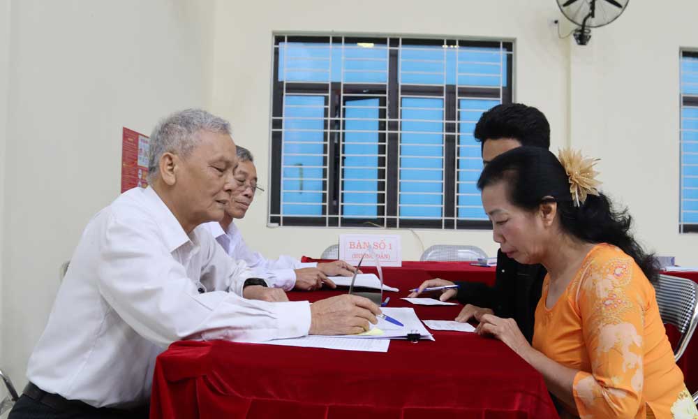 | Thành viên Tổ bầu cử số 10 phường Hạp Lĩnh hướng dẫn cử tri cách viết phiếu trong ngày bầu cử 15/3. Ảnh: Nguyễn Hoa. |