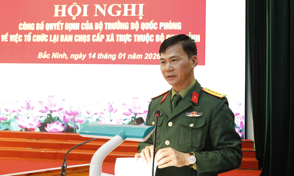 Tại hội nghị, Đại tá Nguyễn Khắc Trung, Phó Chỉ huy trưởng, Tham mưu trưởng Bộ Chỉ huy quân sự tỉnh công bố Quyết định số 142/QĐ-BQP ngày 11/1/2026 của Bộ trưởng Bộ Quốc phòng về việc tổ chức lại ban chỉ huy quân sự cấp xã; Quyết định số 56/QĐ-TM ngày 11/1/2026 của Tổng Tham mưu trưởng về việc ban hành biểu tổ chức biên chế ban chỉ huy quân sự cấp xã, phường trực thuộc Bộ Chỉ huy quân sự tỉnh; Quyết định của Chủ tịch UBND tỉnh về miễn nhiệm chức danh chỉ huy trưởng ban chỉ huy quân sự cấp xã.