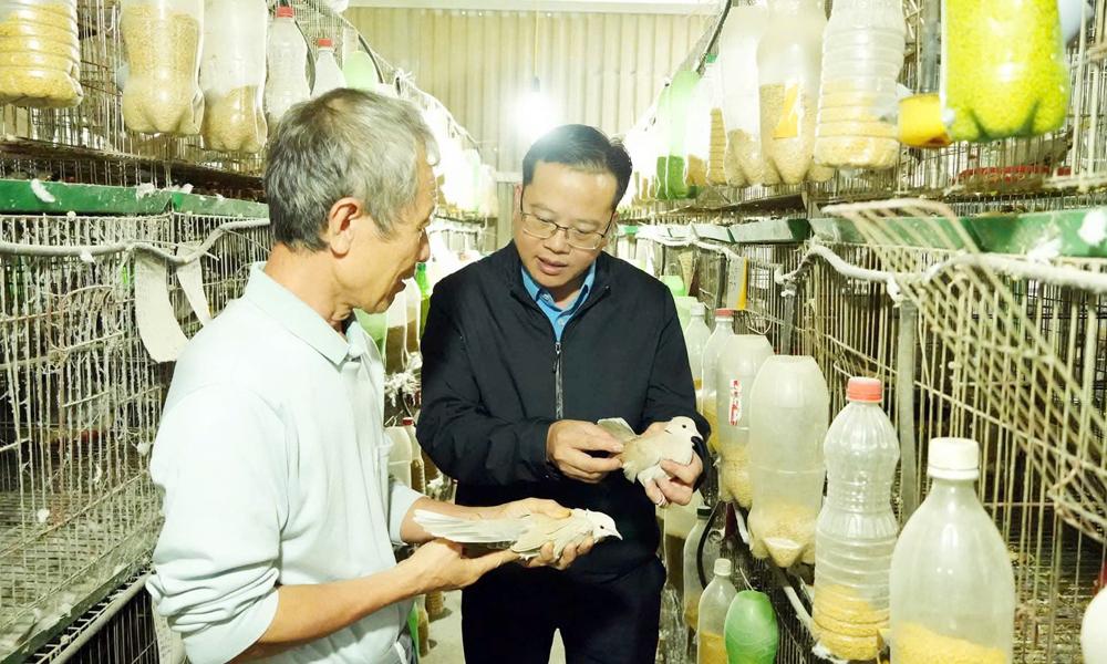 | Đồng chí Nguyễn Văn Long, Chủ tịch UBND xã Tiên Lục (bên phải) tìm hiểu mô hình nuôi chim cu gáy trắng tại thôn Sâu. Ảnh: Thanh Nga. |