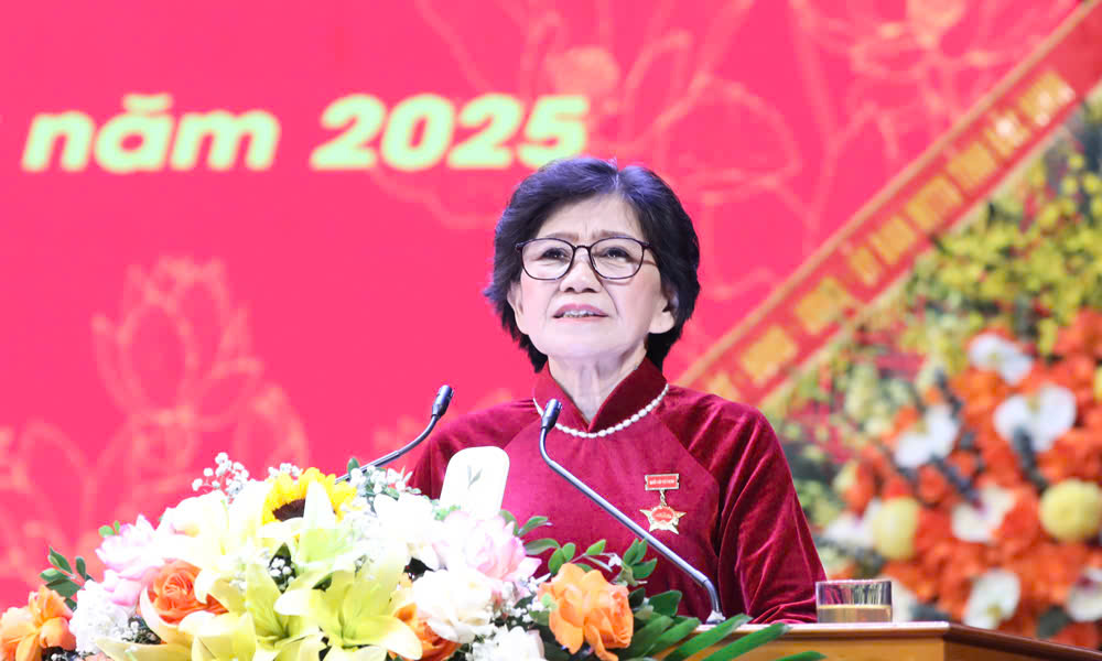 | Đồng chí Hoàng Thị Hoa, nguyên Phó Chủ nhiệm Ủy ban Văn hóa - Giáo dục - Thanh niên, Thiếu niên và Nhi đồng của Quốc hội, nguyên Phó trưởng Đoàn Đại biểu Quốc hội khóa XIII tỉnh Bắc Giang phát biểu tại buổi gặp mặt. |
