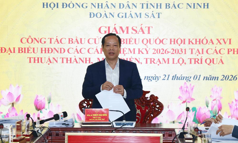 Phát biểu kết luận, Phó Chủ tịch HĐND tỉnh Nghiêm Xuân Hưởng đánh giá cao sự chủ động, nghiêm túc của các địa phương trong triển khai công tác bầu cử đại biểu Quốc hội và đại biểu HĐND các cấp nhiệm kỳ 2026 - 2031. Đồng chí yêu cầu các phường Thuận Thành, Mão Điền, Trạm Lộ và Trí Quả tiếp tục quán triệt và tổ chức thực hiện nghiêm các quy định của của Trung ương, của tỉnh về công tác bầu cử. Chủ động rà soát toàn bộ quy trình bầu cử phân công rõ người, rõ việc, rõ tiến độ, rõ trách nhiệm, bảo đảm các khâu, các bước được triển khai đúng luật, đúng trình tự. Đẩy mạnh công tác thông tin, tuyên truyền về bầu cử, chú trọng hình thức tuyên truyền phù hợp với từng nhóm đối tượng, địa bàn, nhằm tạo sự đồng thuận xã hội. Tổ chức tốt các hội nghị hiệp thương lần thứ 2, thứ 3, xác định cơ cấu, thành phần và số lượng người được giới thiệu ứng cử, bảo đảm đúng quy trình, tính đại diện, cân đối hợp lý giữa các lĩnh vực, giới tính, độ tuổi, thành phần xã hội theo quy định.