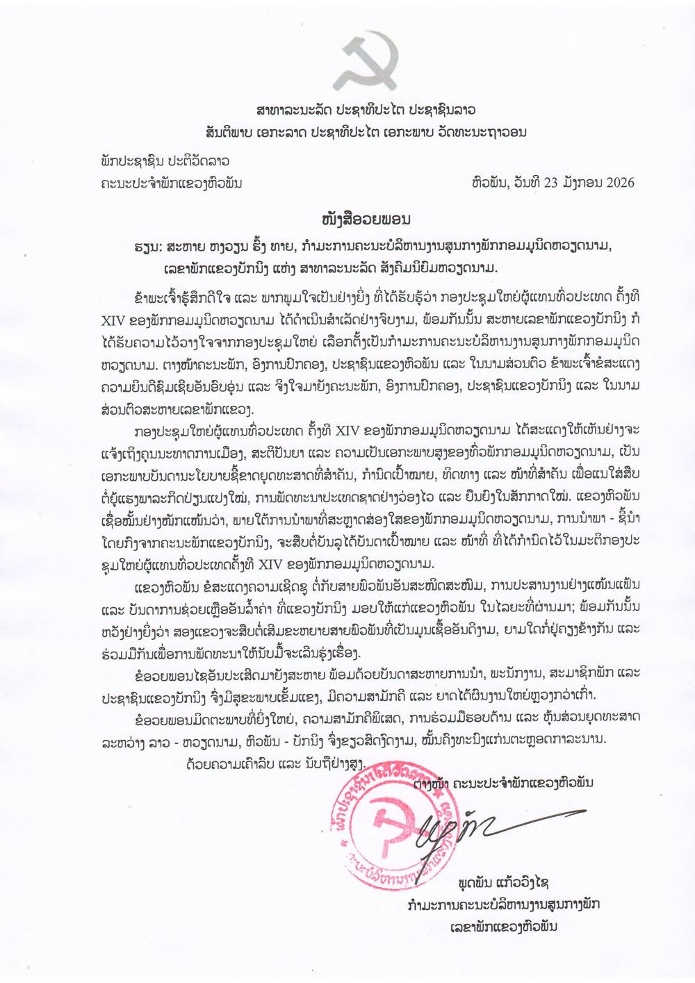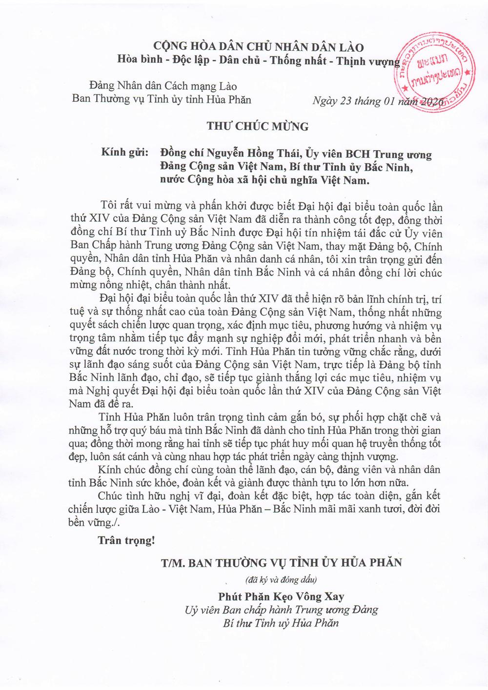 Trong thư, thay mặt Đảng bộ, chính quyền và Nhân dân tỉnh Hủa Phăn, đồng chí Phút Phăn Kẹo Vông Xay bày tỏ phấn khởi trước thành công rực rỡ của Đại hội đại biểu toàn quốc lần thứ XIV Đảng Cộng sản Việt Nam. Đặc biệt, lãnh đạo tỉnh Hủa Phăn gửi lời chúc mừng nồng nhiệt nhất tới đồng chí Nguyễn Hồng Thái khi được Đại hội tín nhiệm, tái đắc cử vào Ban Chấp hành Trung ương Đảng khóa XIV.