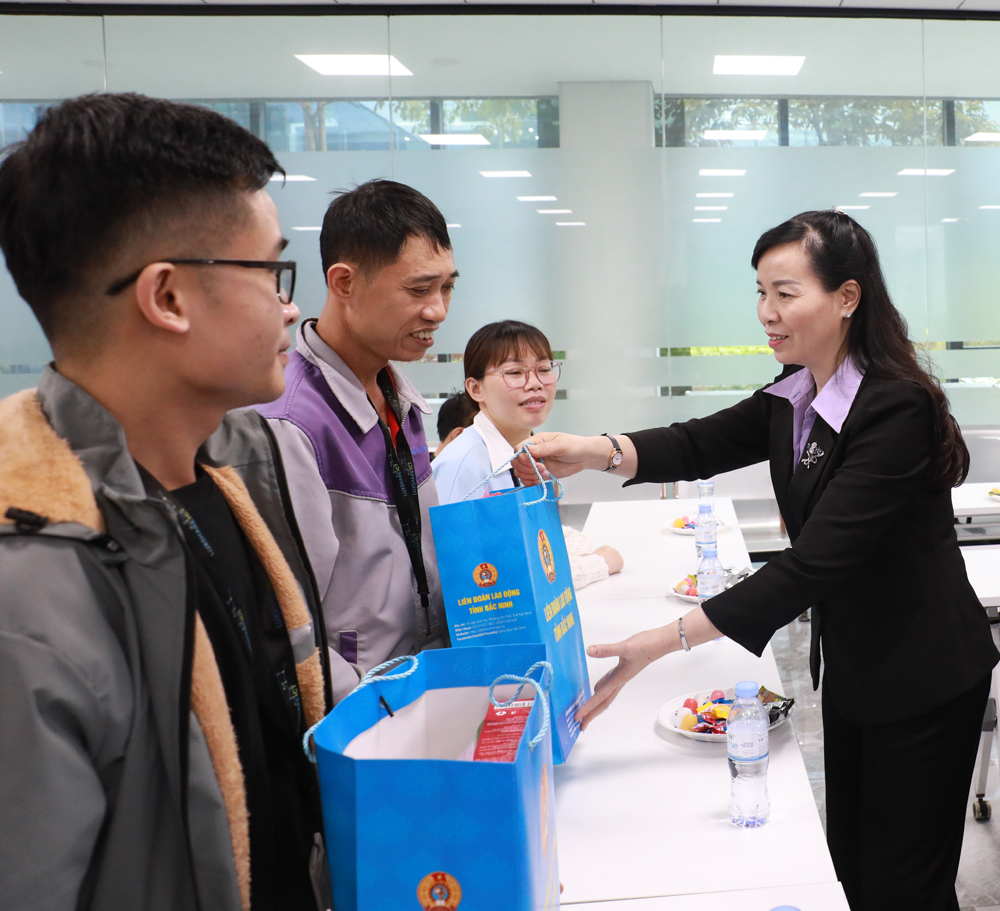 | Đồng chí Nguyễn Hồng Thái tặng quà Tết đoàn viên, người lao động Công ty trách nhiệm hữu hạn Luxshare-ICT (Vân Trung) không về quê ăn Tết. |