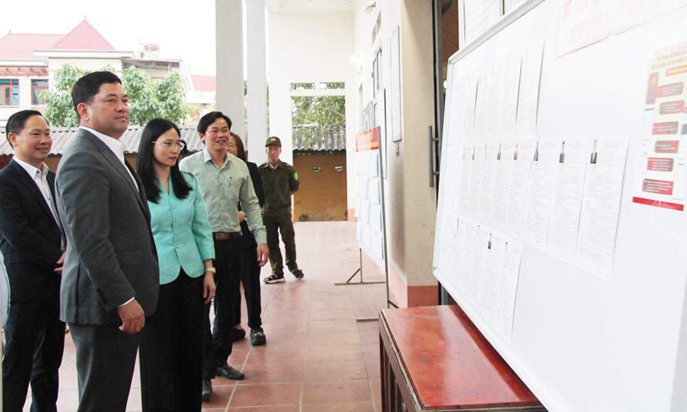 | Bí thư Tỉnh ủy Nguyễn Hồng Thái kiểm tra nơi niêm yết danh sách ứng cử viên đại biểu Quốc hội và đại biểu HĐND các cấp tại thôn Tân Sơn 1, xã tân Dĩnh. |