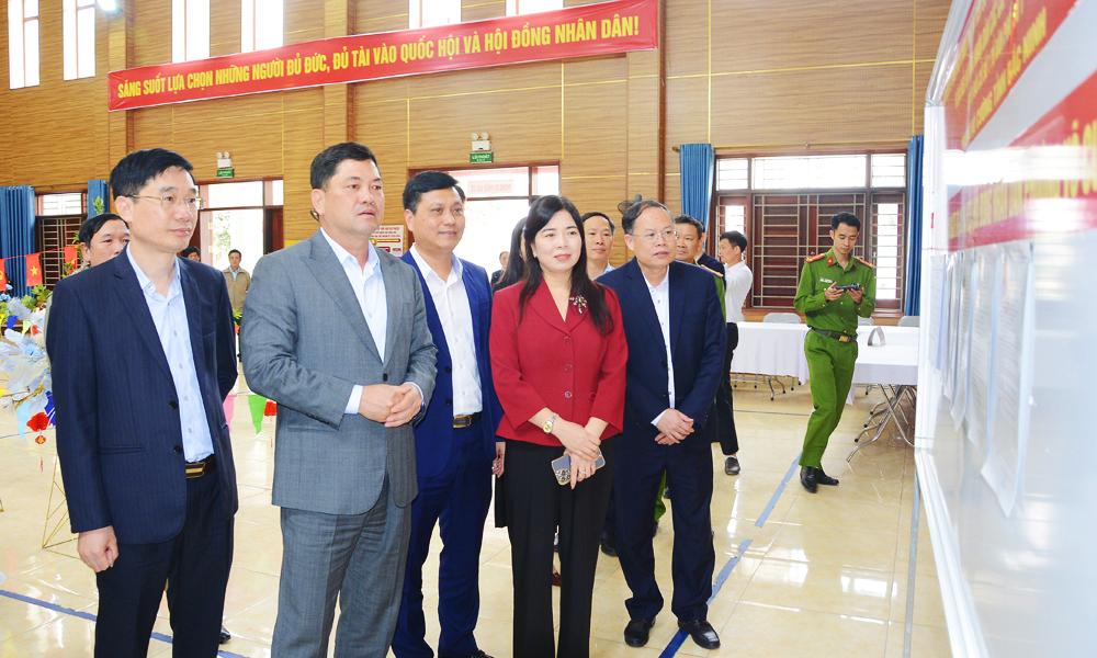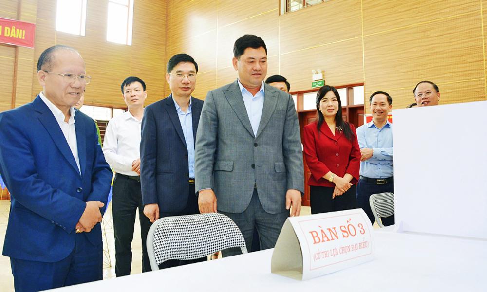 | Bí thư Tỉnh ủy Nguyễn Hồng Thái kiểm tra khu vực bàn ghi phiếu bầu của cử tri tại tổ dân phố 1. |