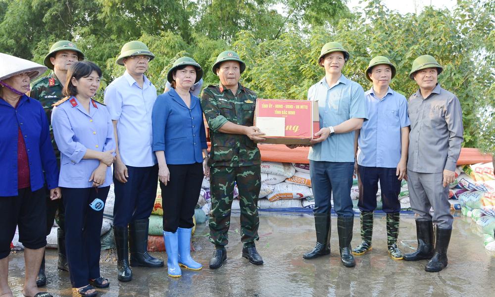 | Đồng chí Vương Quốc Tuấn cùng các đồng chí lãnh đạo trao tặng quà của Tỉnh ủy, HĐND, UBND, Ủy ban MTTQ tỉnh cho lực lượng Quân đội tham gia đắp đê, chống tràn tại tuyến đê bối Đẩu Hàn, phường Kinh Bắc. |
