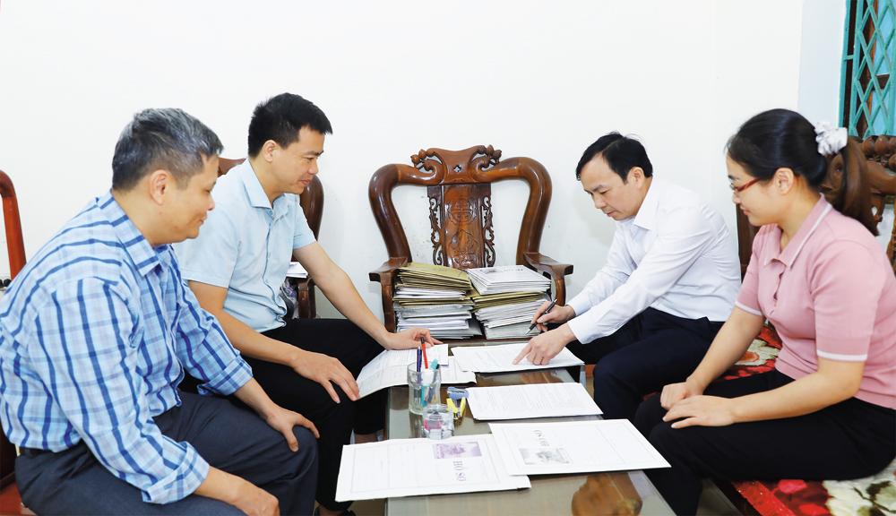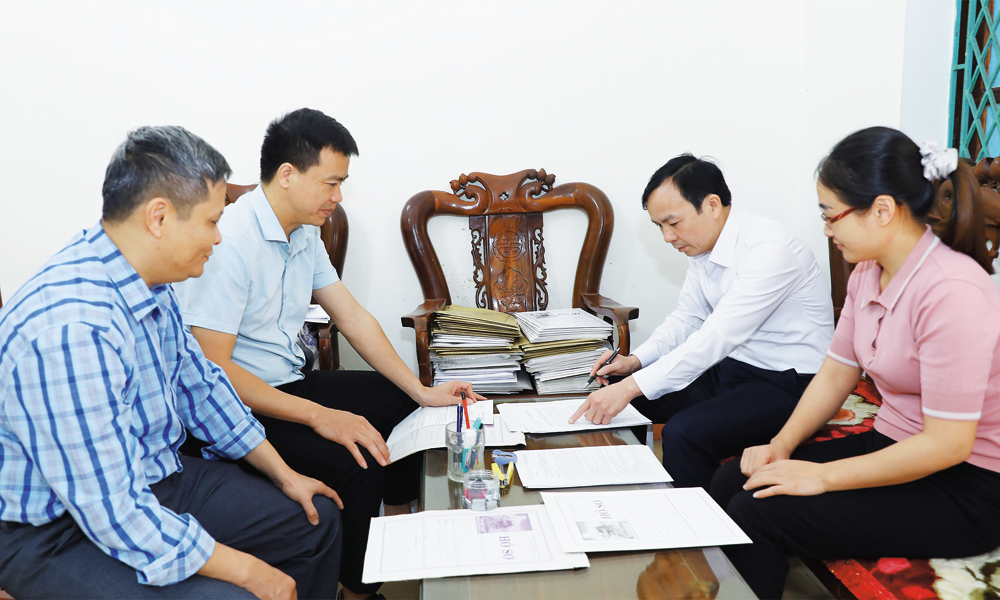 Cán bộ Ủy ban Kiểm tra Đảng ủy xã Lục Nam trao đổi nghiệp vụ kiểm tra, giám sát.