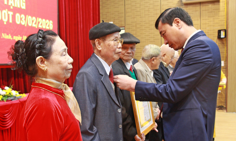 Lãnh đạo Ban Tổ chức Tỉnh ủy và Đảng ủy phường Vũ Ninh trao Huy hiệu 70, 65, 60 năm tuổi Đảng cho các đảng viên. |