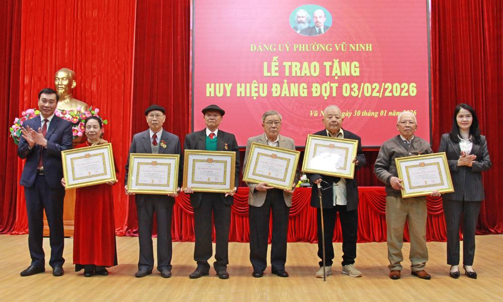 Đợt 3/2, Đảng bộ phường Vũ Ninh vinh dự có 47 đảng viên được nhận Huy hiệu Đảng. Trong đó, 2 đảng viên 70 năm tuổi Đảng; 2 đảng viên 65 năm tuổi Đảng; 6 đảng viên 60 năm tuổi Đảng; 4 đảng viên 55 năm tuổi Đảng; 5 đảng viên 50 năm tuổi Đảng; 13 đảng viên 45 năm tuổi Đảng; 8 đảng viên 40 năm tuổi Đảng; 7 đảng viên 30 năm tuổi Đảng.