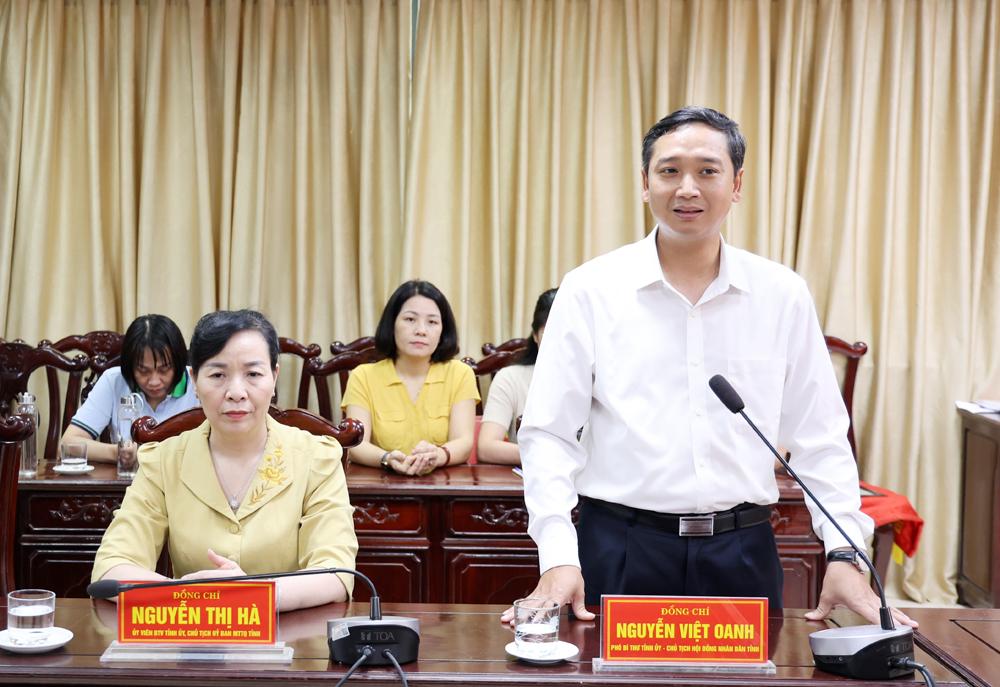 Tiếp đoàn công tác có các đồng chí: Nguyễn Việt Oanh, Phó Bí thư Tỉnh ủy, Chủ tịch HĐND tỉnh; Nguyễn Thị Hà, Ủy viên Ban Thường vụ Tỉnh ủy, Chủ tịch Ủy ban MTTQ tỉnh.