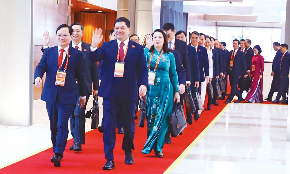 Đoàn đại biểu Đảng bộ tỉnh Bắc Ninh tiến vào hội trường Trung tâm Hội nghị Quốc gia. |