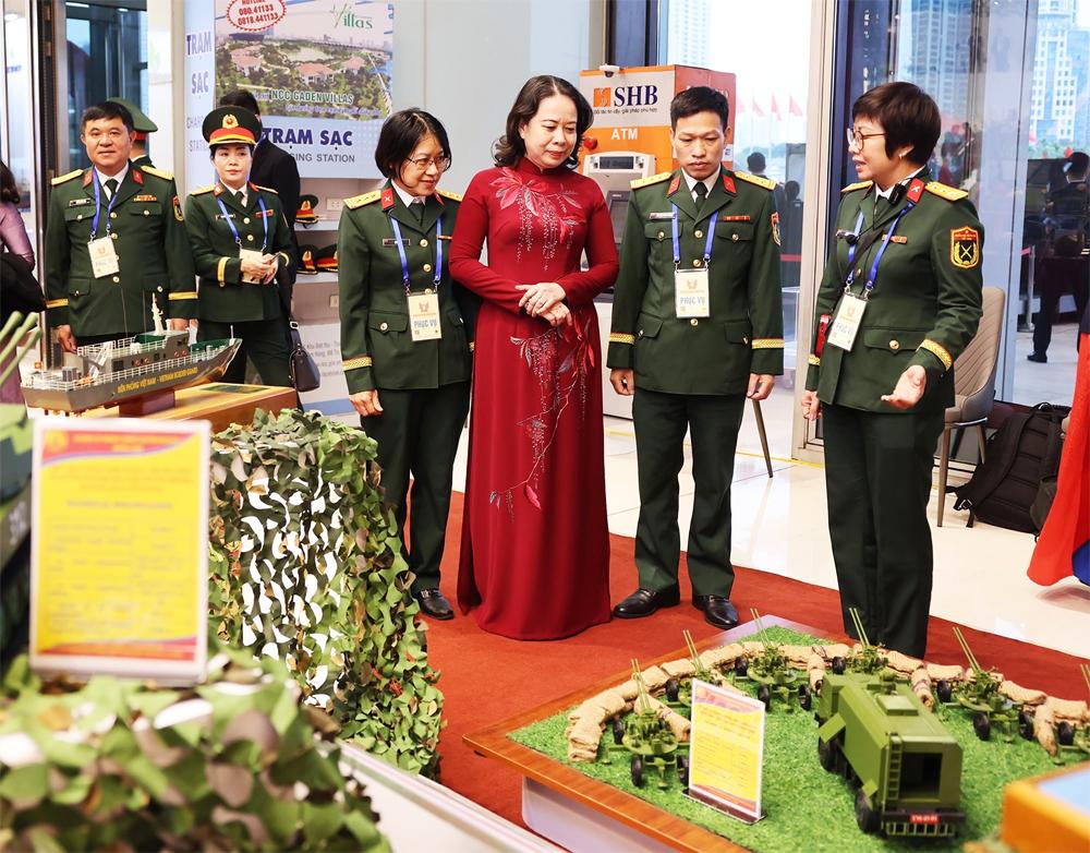| Phó Chủ tịch nước Võ Thị Ánh Xuân, Phó Chủ tịch thứ nhất Hội đồng Thi đua - Khen thưởng Trung ương tham quan gian trưng bày sản phẩm của Bộ Quốc phòng. |