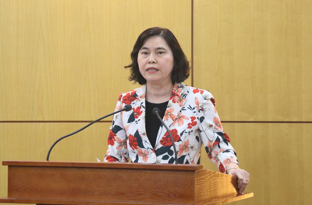 | Đồng chí Trần Thị Hằng phát biểu tại buổi họp báo. |