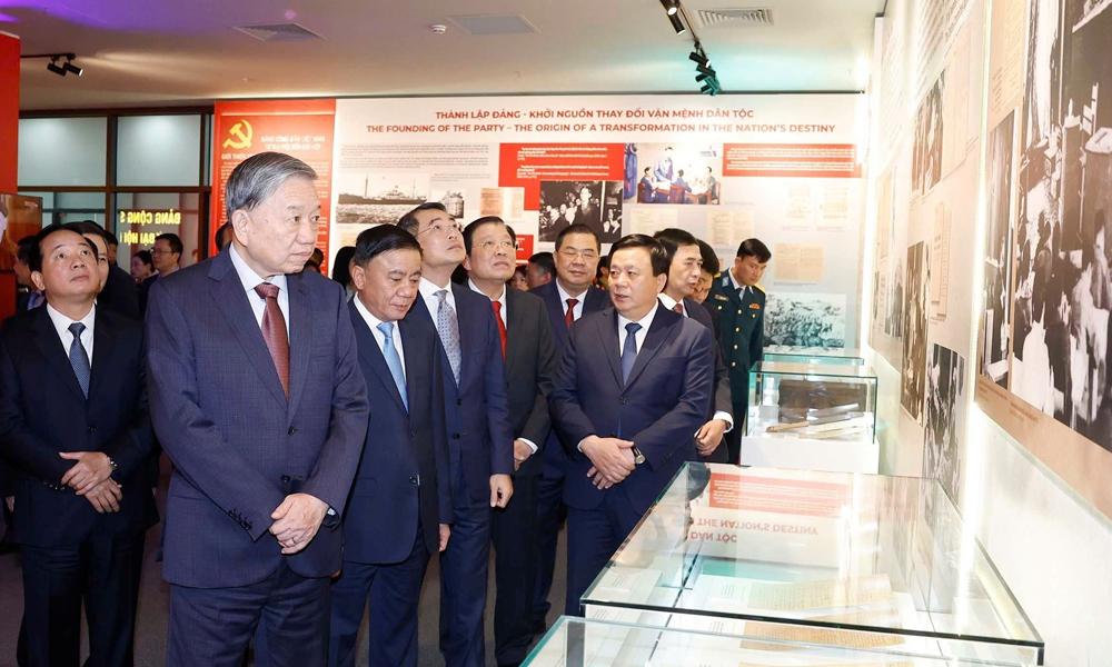 | Tổng Bí thư Tô Lâm và các đồng chí lãnh đạo Đảng, Nhà nước tham quan triển lãm. |