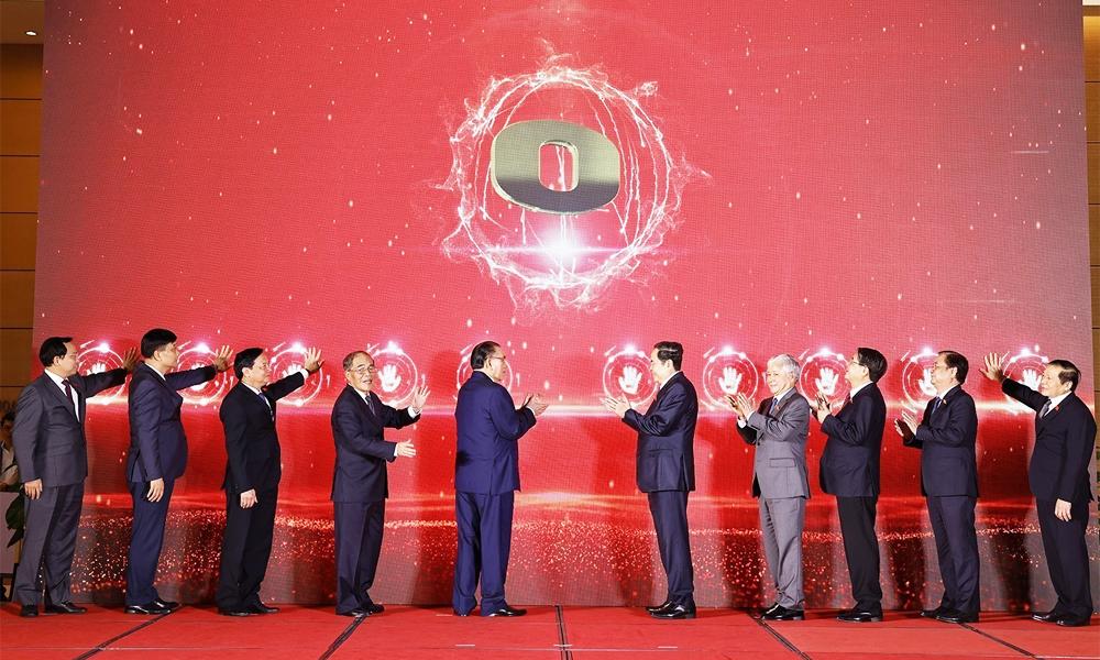 | Các đồng chí lãnh đạo, nguyên lãnh đạo Đảng, Nhà nước và các đại biểu thực hiện nghi thức khai trương Bảo tàng Quốc hội Việt Nam. |