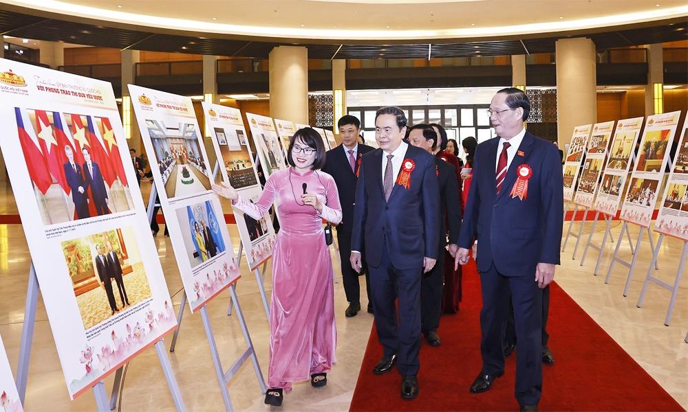 | Chủ tịch Quốc hội Trần Thanh Mẫn và lãnh đạo Quốc hội xem Triển lãm Uỷ ban Thường vụ Quốc hội với phong trào thi đua yêu nước. |