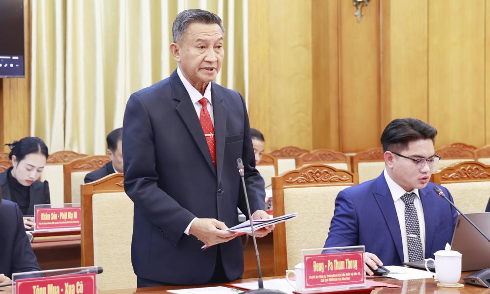 | Lãnh đạo tỉnh Xay Sổm Bun phát biểu tại một buổi làm việc với lãnh đạo tỉnh Bắc Ninh. |