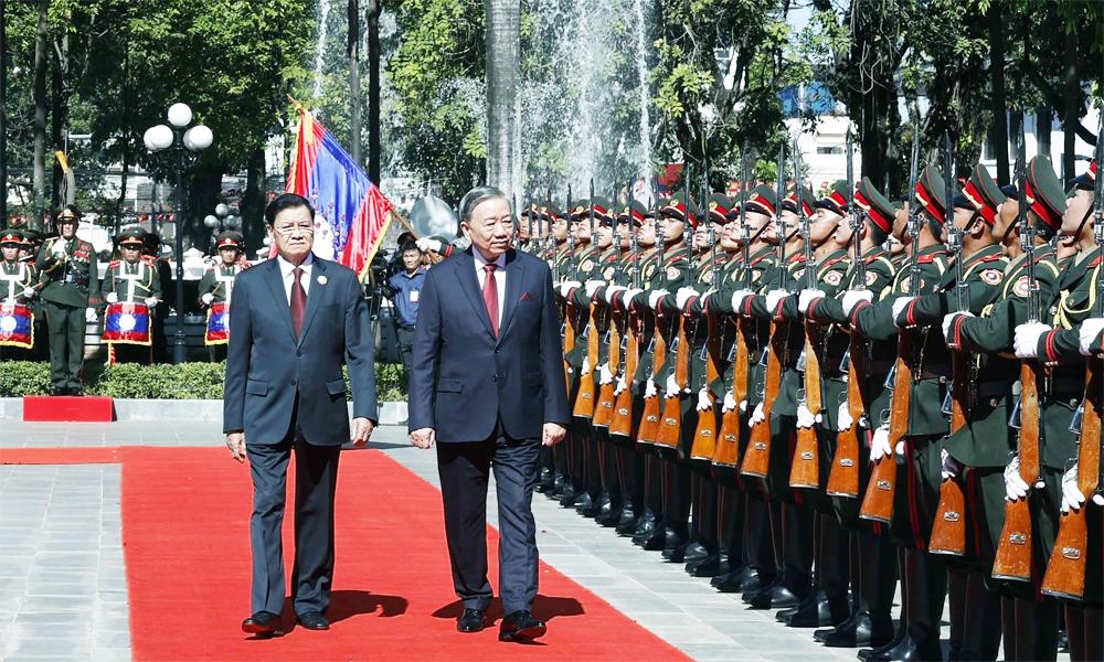 | Tổng Bí thư, Chủ tịch nước Lào Thongloun Sisoulith và Tổng Bí thư Tô Lâm duyệt Đội danh dự Quân đội nhân dân Lào sáng 1/12/2025. Ảnh: TTXVN |