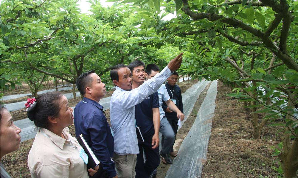 | Đoàn cán bộ, nông dân tỉnh Xay Sổm Bun học tập kinh nghiệm trồng cây ăn quả tại tỉnh Bắc Ninh. |