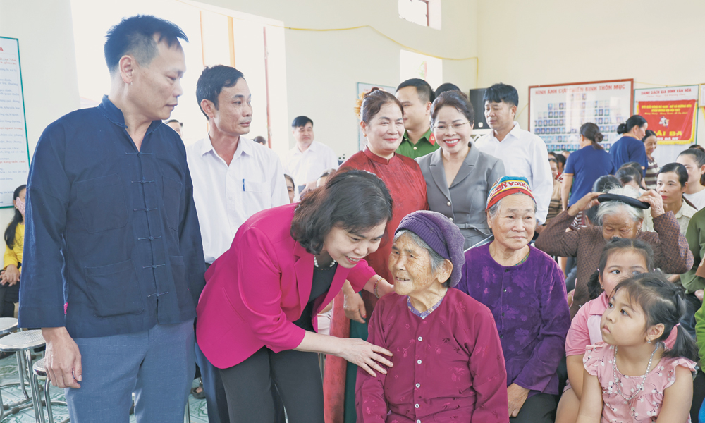 | Phó Chủ tịch Thường trực HĐND tỉnh Trần Thị Hằng thăm hỏi, động viên bà con thôn Mục (xã Dương Hưu) tại Ngày hội Đại đoàn kết toàn dân tộc. |