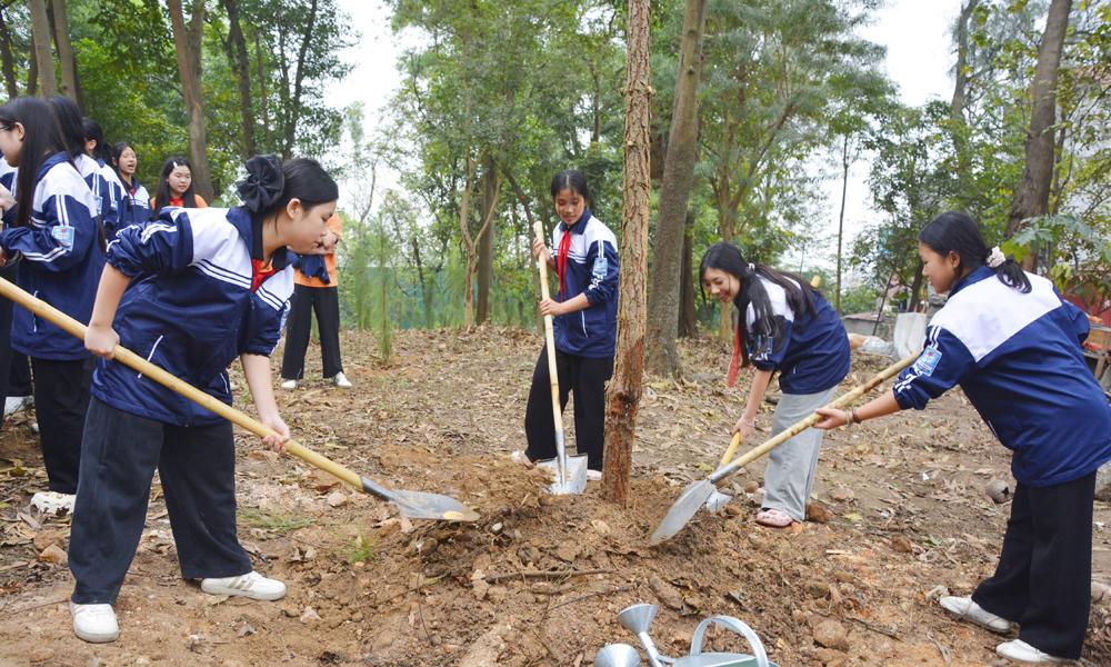 | Các em học sinh tham gia trồng cây. |
