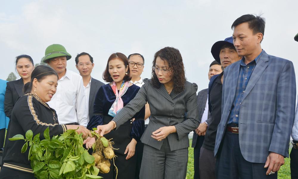 | Đồng chí Nguyễn Thị Hương thăm mô hình trồng khoai tây của Hợp tác xã Nông nghiệp Trường An. |
