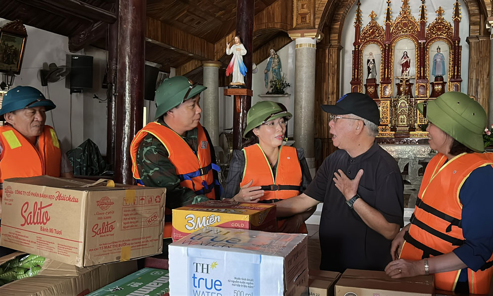 | Các đồng chí lãnh đạo thăm hỏi, động viên linh mục Nguyễn Văn Định và bà con tại Giáo xứ Mỹ Lộc, xã Tiên Lục. |