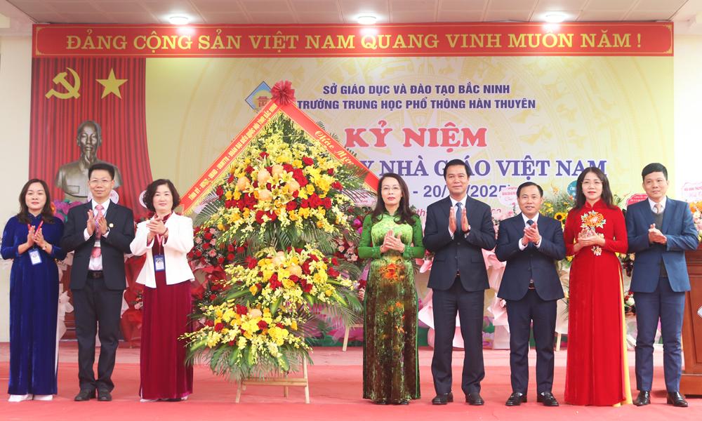 | Các đồng chí lãnh đạo tỉnh, ngành tặng hoa chúc mừng các nhà giáo Trường Trung học phổ thông Hàn Thuyên. |
