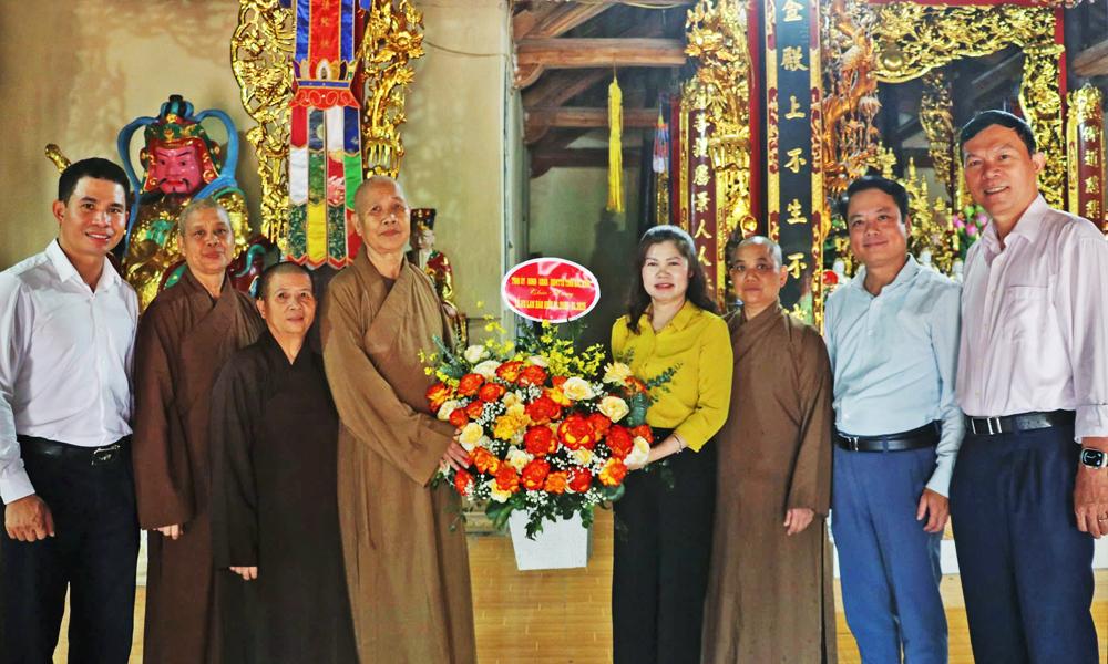 | Đồng chí Lâm Thị Hương Thành đến thăm, chúc mừng chức sắc tại chùa Tổ (Phúc Nghiêm tự), phường Song Liễu. |