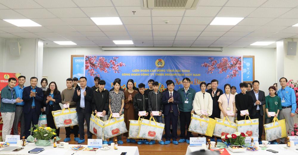 | Đồng chí Nguyễn Anh Tuấn và lãnh đạo Công ty Dreamtech Việt Nam tặng quà, chúc Tết người lao động. |