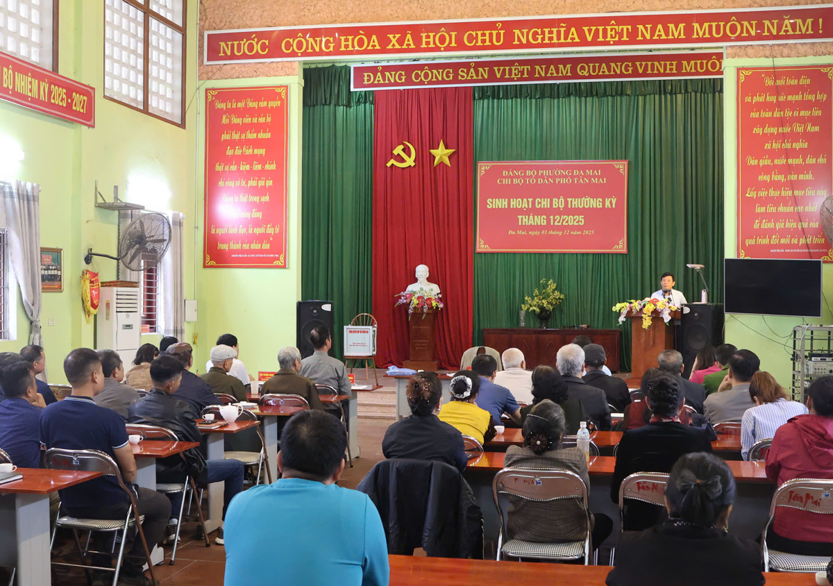 Chi bộ Tổ dân phố Tân Mai có 40 đảng viên. Tại buổi sinh hoạt, sau khi nghe quán triệt, học tập tư tưởng, tấm gương, đạo đức, phong cách Hồ Chí Minh và thông tin tình hình thời sự, chính trị quốc tế, trong nước và của tỉnh, các đảng viên trong Chi bộ tập trung đánh giá, kiểm điểm công tác lãnh đạo thực hiện nhiệm vụ tháng 11 và triển khai phương hướng tháng 12/2025.