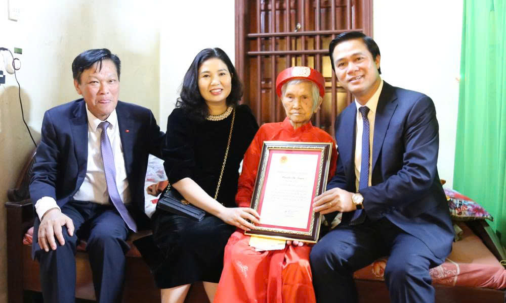 | Các đồng chí: Lê Xuân Lợi, Trần Thị Vân chia vui cùng cụ Nguyễn Thị Tuyến. |