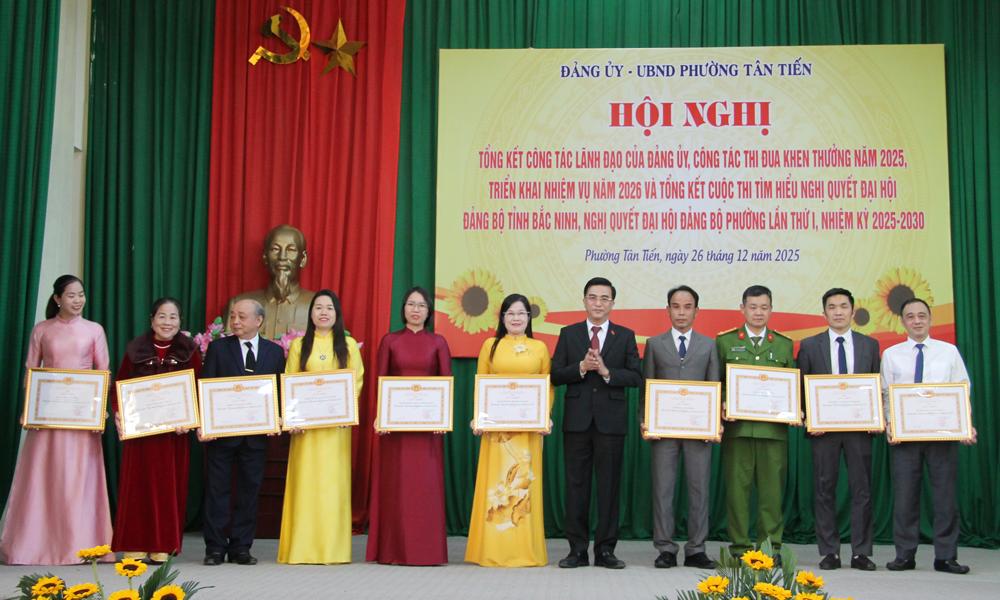 Tại hội nghị, Đảng ủy phường tổ chức trao giải Cuộc thi trực tuyến “Tìm hiểu Nghị quyết Đại hội đại biểu Đảng bộ tỉnh Bắc Ninh và Nghị quyết Đại hội đại biểu Đảng bộ phường Tân Tiến lần thứ I, nhiệm kỳ 2025 - 2030”. Cuộc thi diễn ra trong 4 tuần (từ 10/11 đến 7/12/2025) đã thu hút 71.445 lượt cán bộ, đảng viên và Nhân dân trong phường tham gia. Ban Tổ chức đã trao 28 giải cá nhân, Chủ tịch UBND phường khen thưởng 3 tập thể, 4 cá nhân có thành tích xuất sắc trong công tác tham mưu, tổ chức triển khai Cuộc thi.
